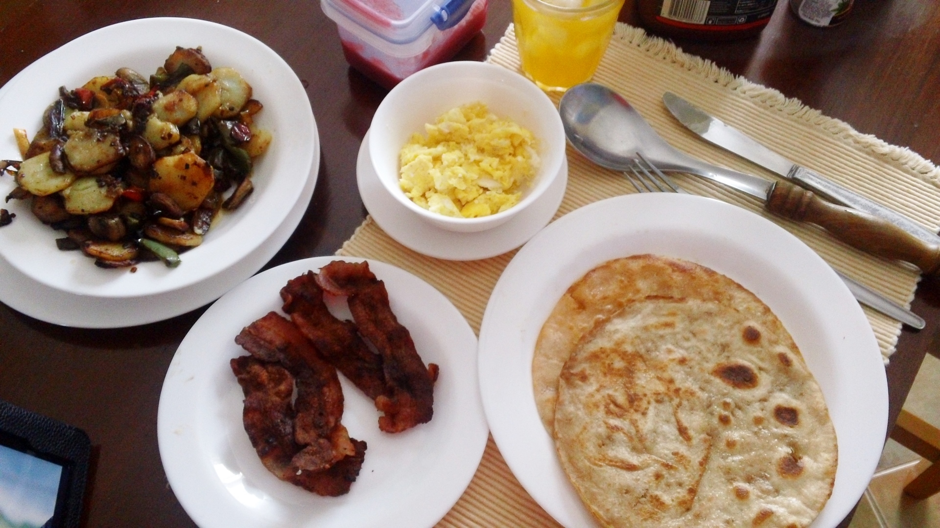 Got creative with some soft taco tortillas and some baby red potatoes. Added in a rare find of “hot” peppers from Alejandra’s and desayuno was baggin’!! 🙂
