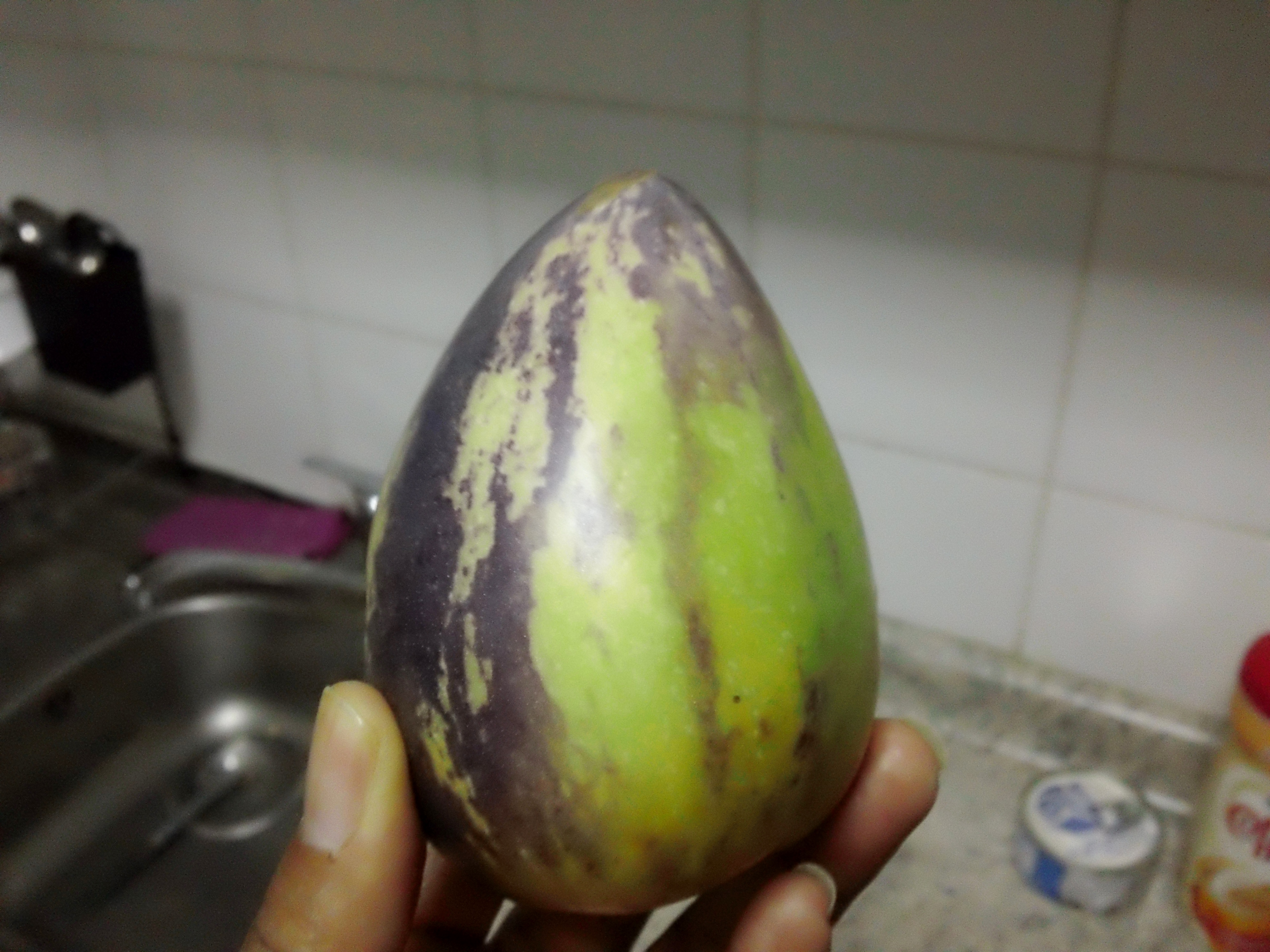 The gentleman at our neighborhood fruit and vegetable store is always so accommodating of my foreigner’s curiosity. Today, they had this little baby arrive, and I immediately asked him to write the name down for me so I could research it upon my return home. He called it a Pepino de Fruta, but a quick Wikipedia search names its parent shrub Solanum muricatum. It appears to be the fruit of this evergreen species of plant. It certainly doesn’t smell like any Christmas Trees that I’ve experiences and when I asked the gentlemen, “¿Es dulce?” (Is it sweet?), he assured me that it was. Here are some other image links that came up on the internet when I search for Pepino de Fruta. After my last delicacy fail with my combo mango and maracuyá(Passion fruit) juice that I purchased; I hope this little fruit adventure doesn’t disappoint. I’ll let you know! 😉